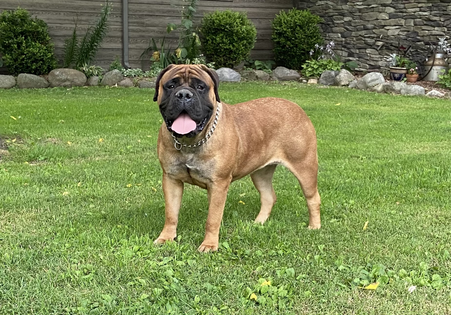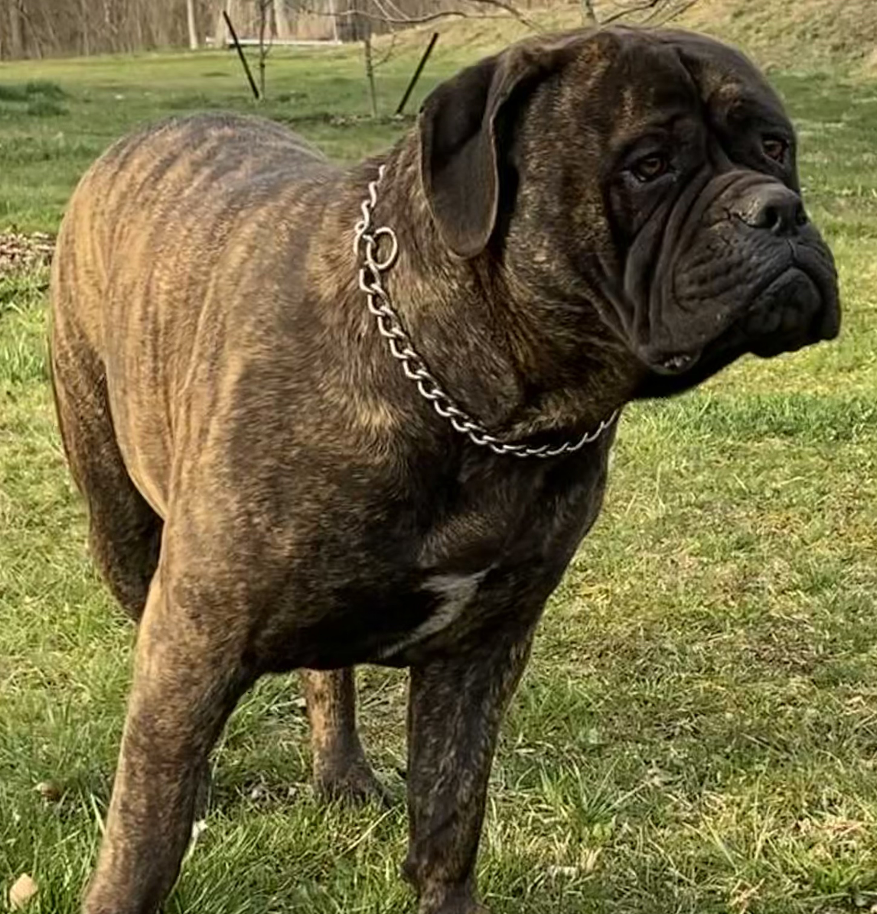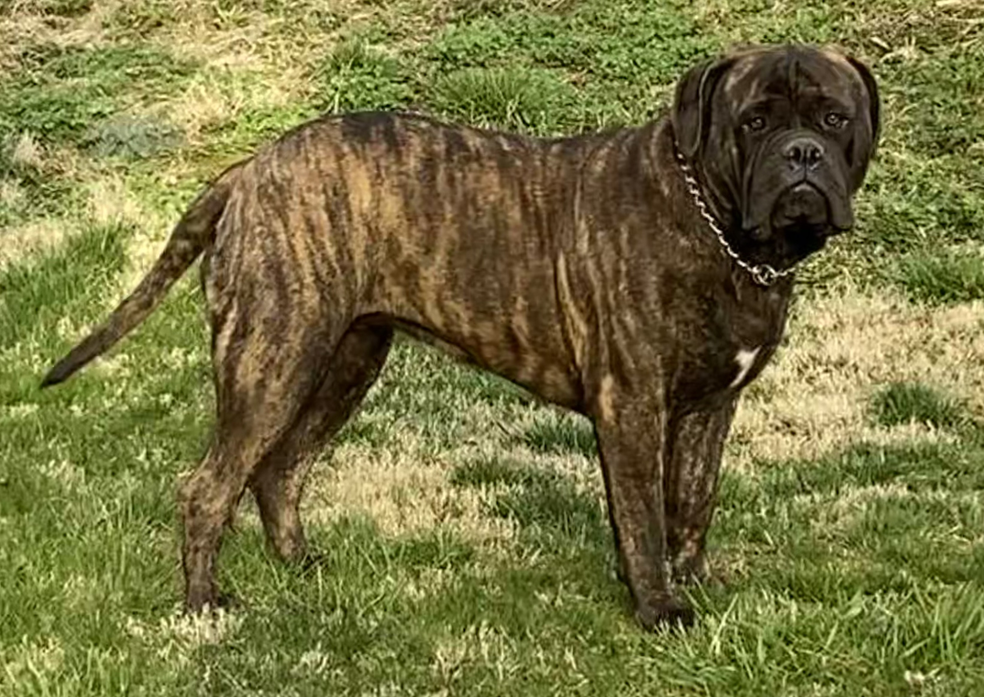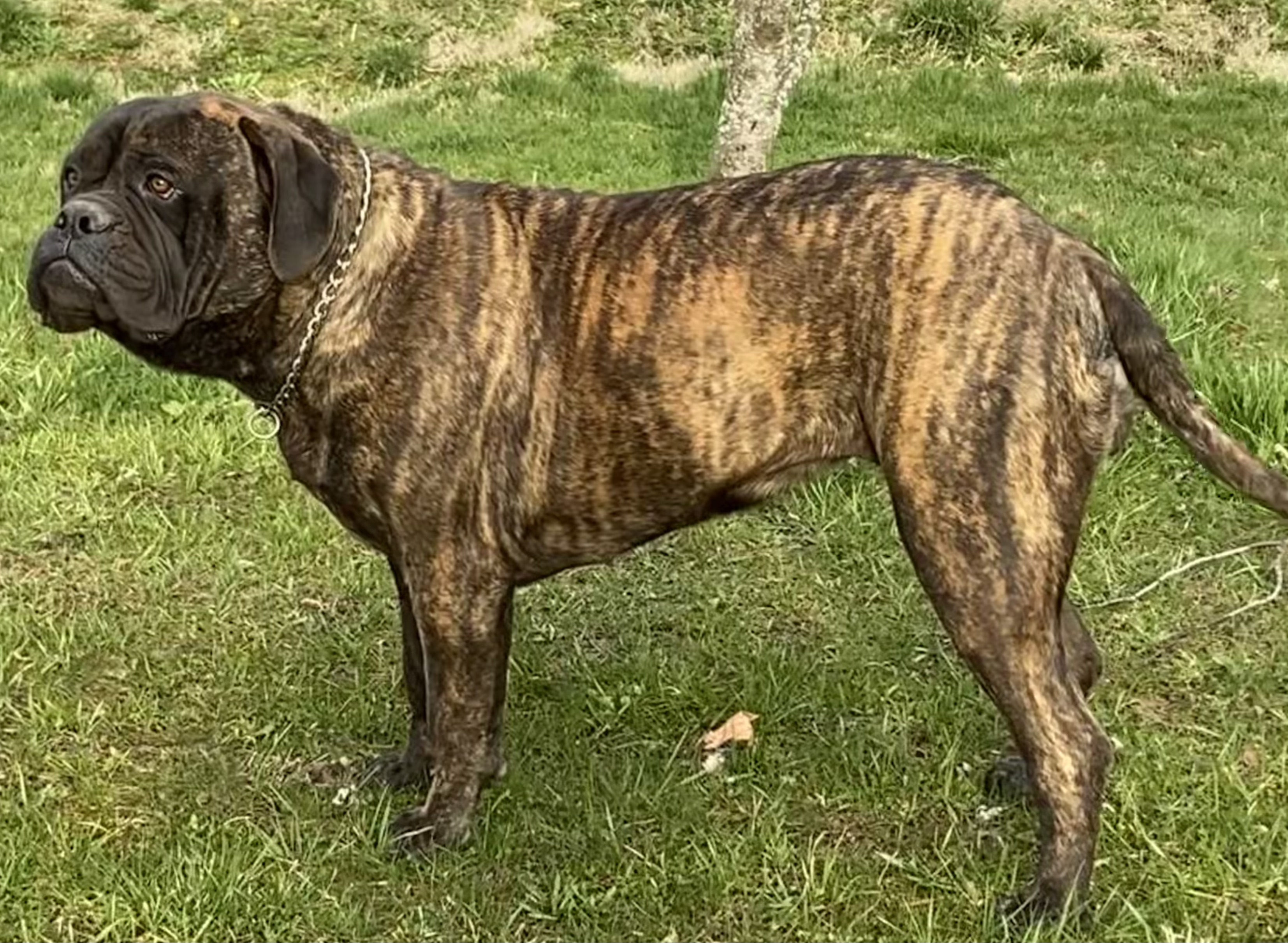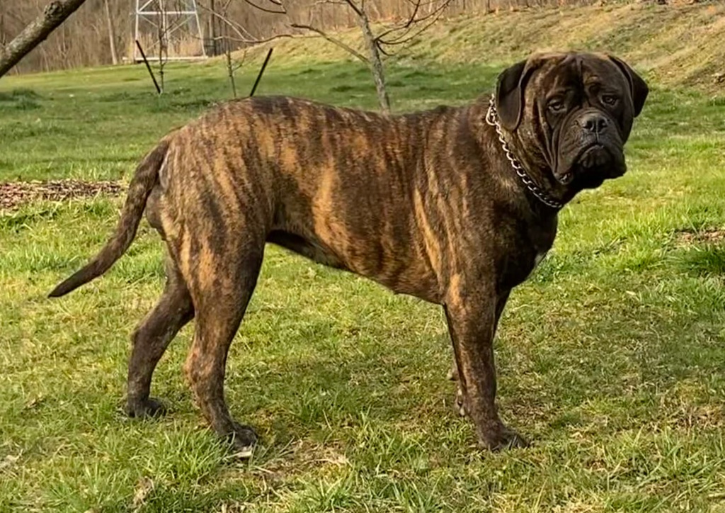 Cinder is beautiful, red brindle with a broad chest and thick bones. She is a happy, playful girl. She stays active around the farm and likes to play around with the other dogs. She is one of our best guard dogs.