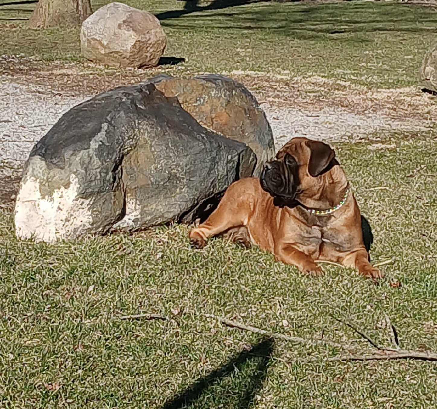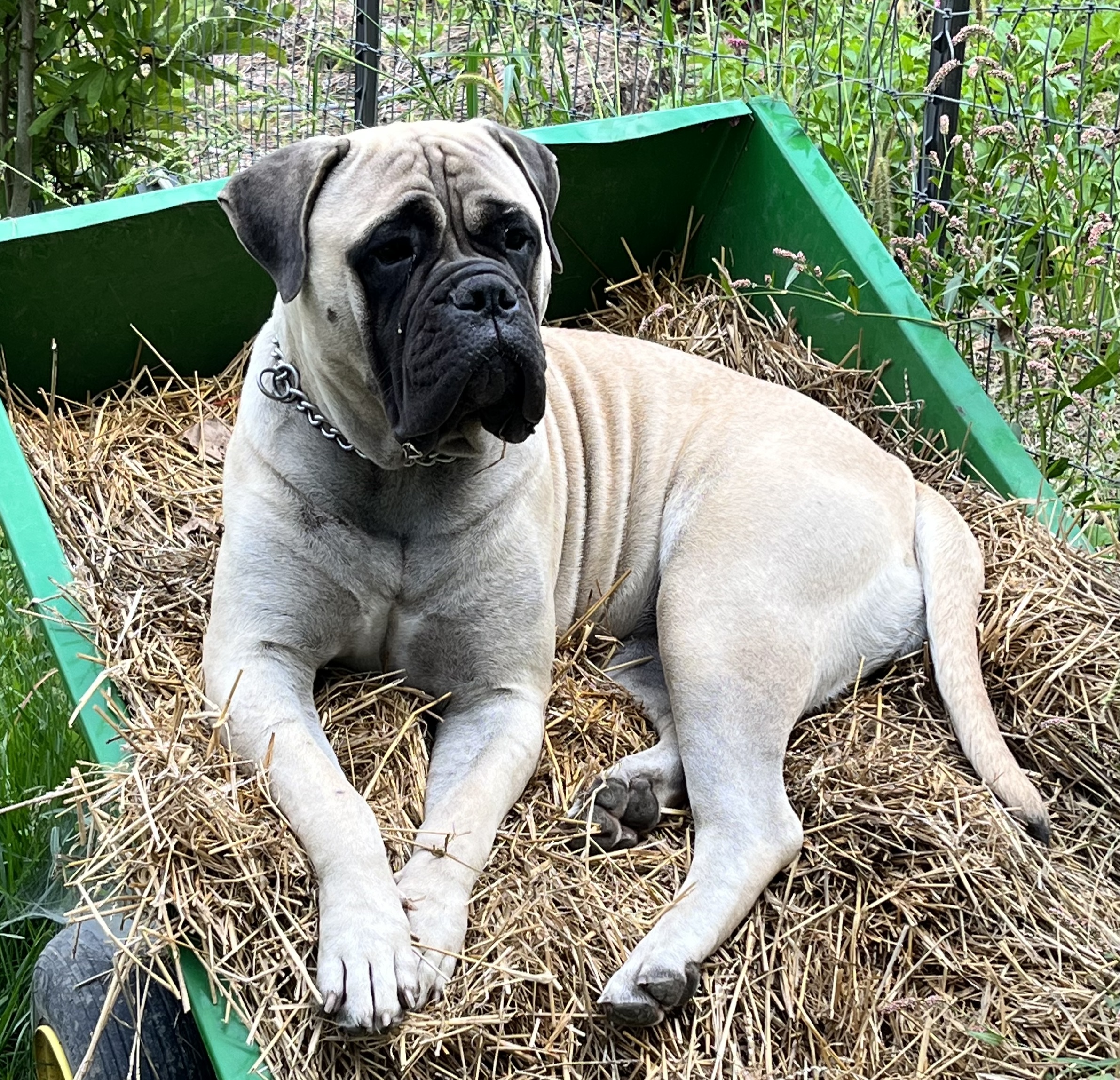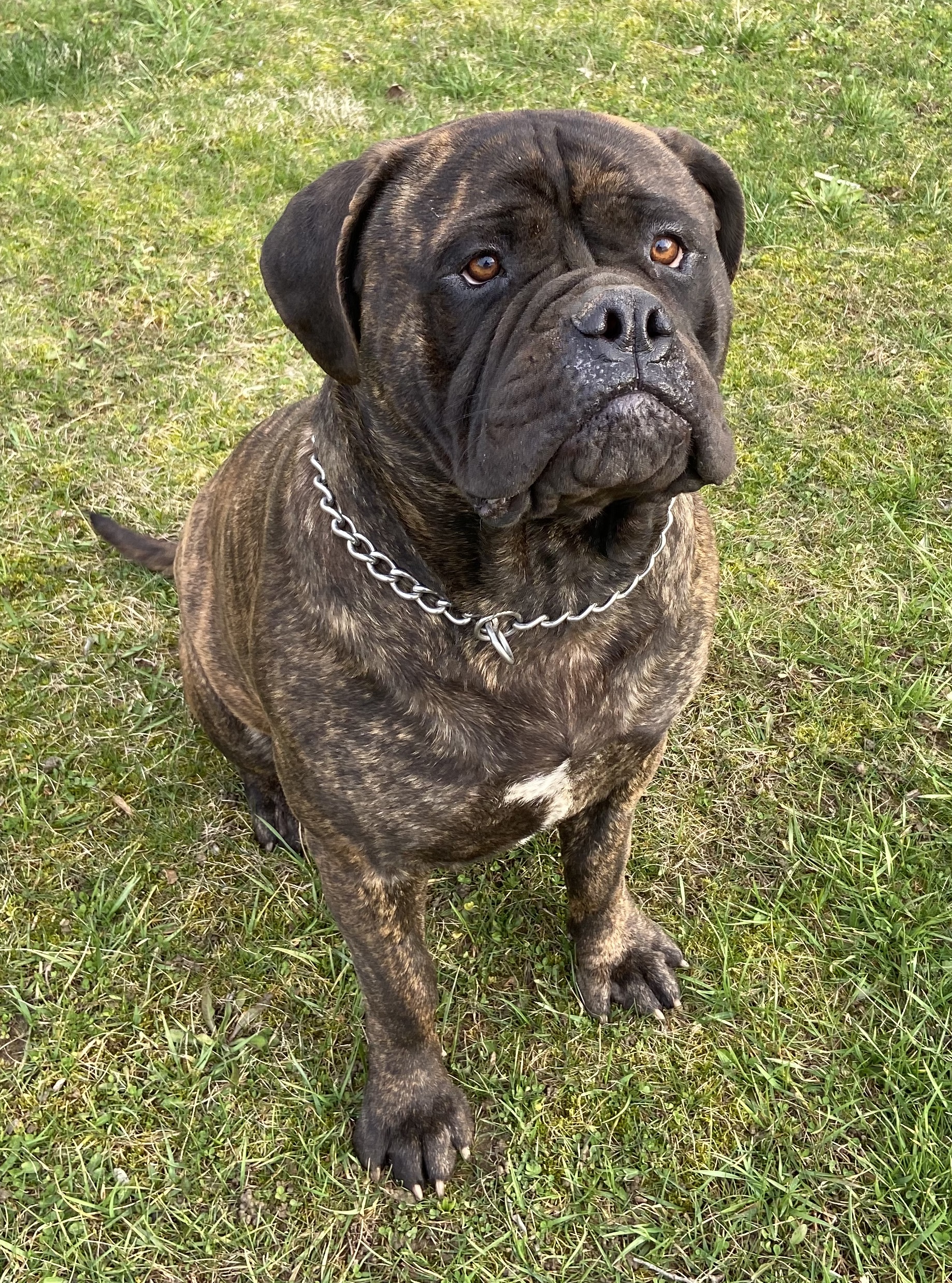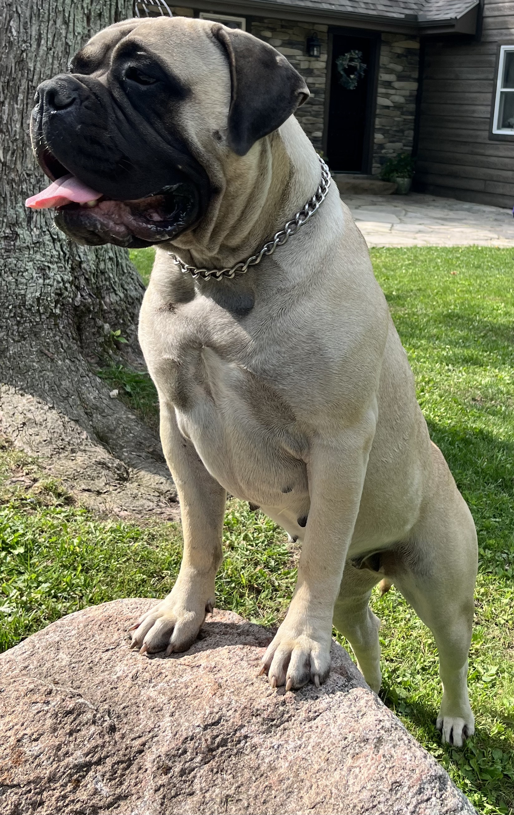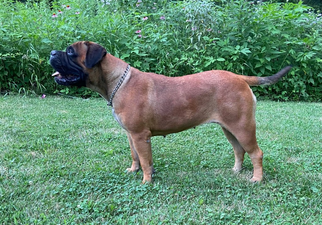 Cinder is beautiful, red brindle with a broad chest and thick bones. She is a happy, playful girl. She stays active around the farm and likes to play around with the other dogs. She is one of our best guard dogs.