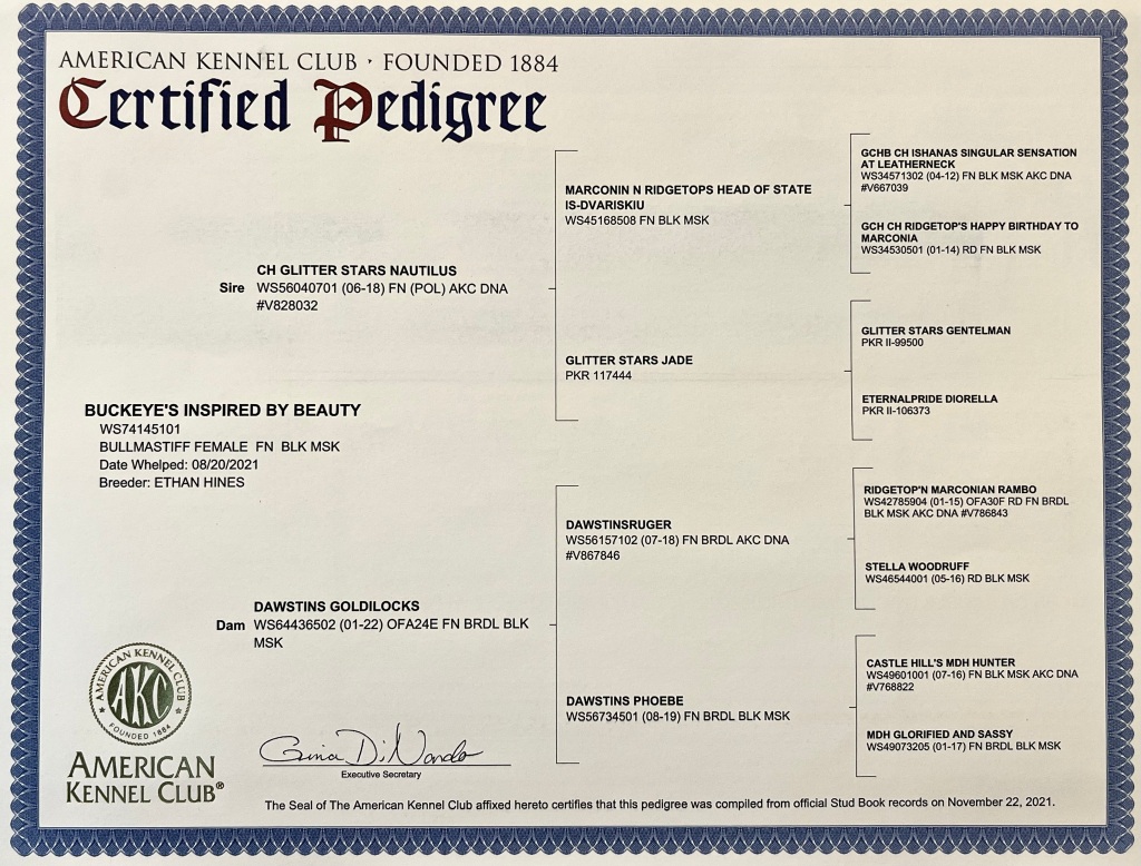 Our females are AKC certified and come from fantastic lines. Check out their pedigrees below. As with our males, we feed them a high quality dog food and supplement with fresh bones as we have them available. They are all up to date on their vaccinations and receive regular grooming. All of our dogs receive lots of love and have room to explore (and lounge!) around our five acre mini-farm. Our mamas have their own private dog house when they give birth to their puppies so they can be closely monitored. As you can see, we have worked hard to love on our dogs and provide a quality puppy for your home!